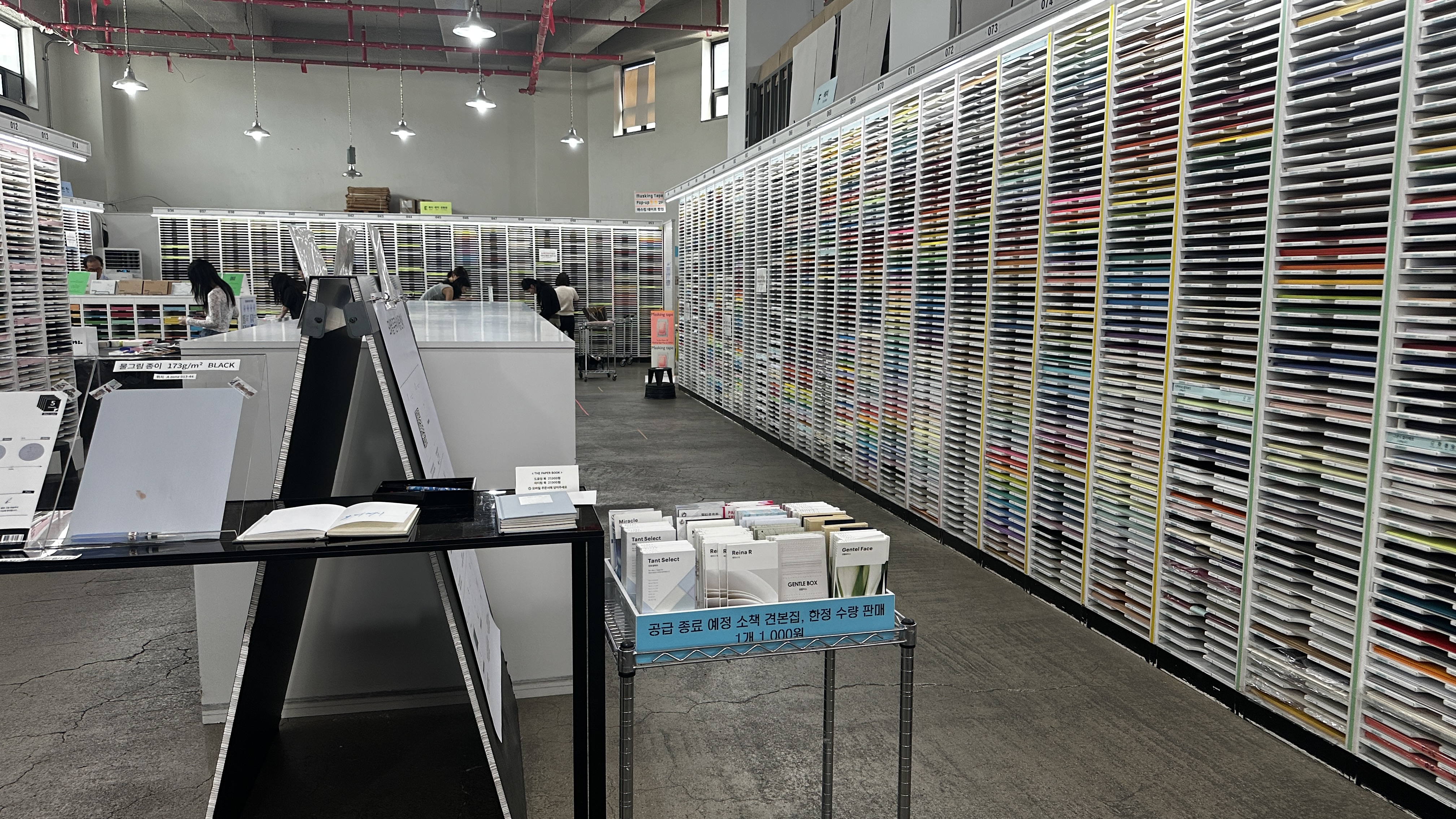 종이가 다양한 만큼 출판사에는 보통 표지와 내지에 사용하는 종이 견본집이 있는데, 맨땅에 서 있는 1인 출판사는 종이 견본집을 구하는 일부터 시작해야 합니다. 몇몇 제지사에 견본집을 받을 수 있는지 문의하는 메일을 보내면, 어떤 곳은 감사하게도 견본집을 보내주겠다는 회신을 보내주지만, 그러지 않는 곳은 견본집을 구매해야 하지요. 그래서 견본집을 구매하러 두성종이에서 운영하는 인더페이퍼를 찾았습니다. 두성종이는 개인적으로 표지에 애용하는 종이인지라, 샘플을 볼 수 있는 인더페이퍼에 들러 다양한 종이를 구경하고 몇몇 견본집을 들여왔습니다.