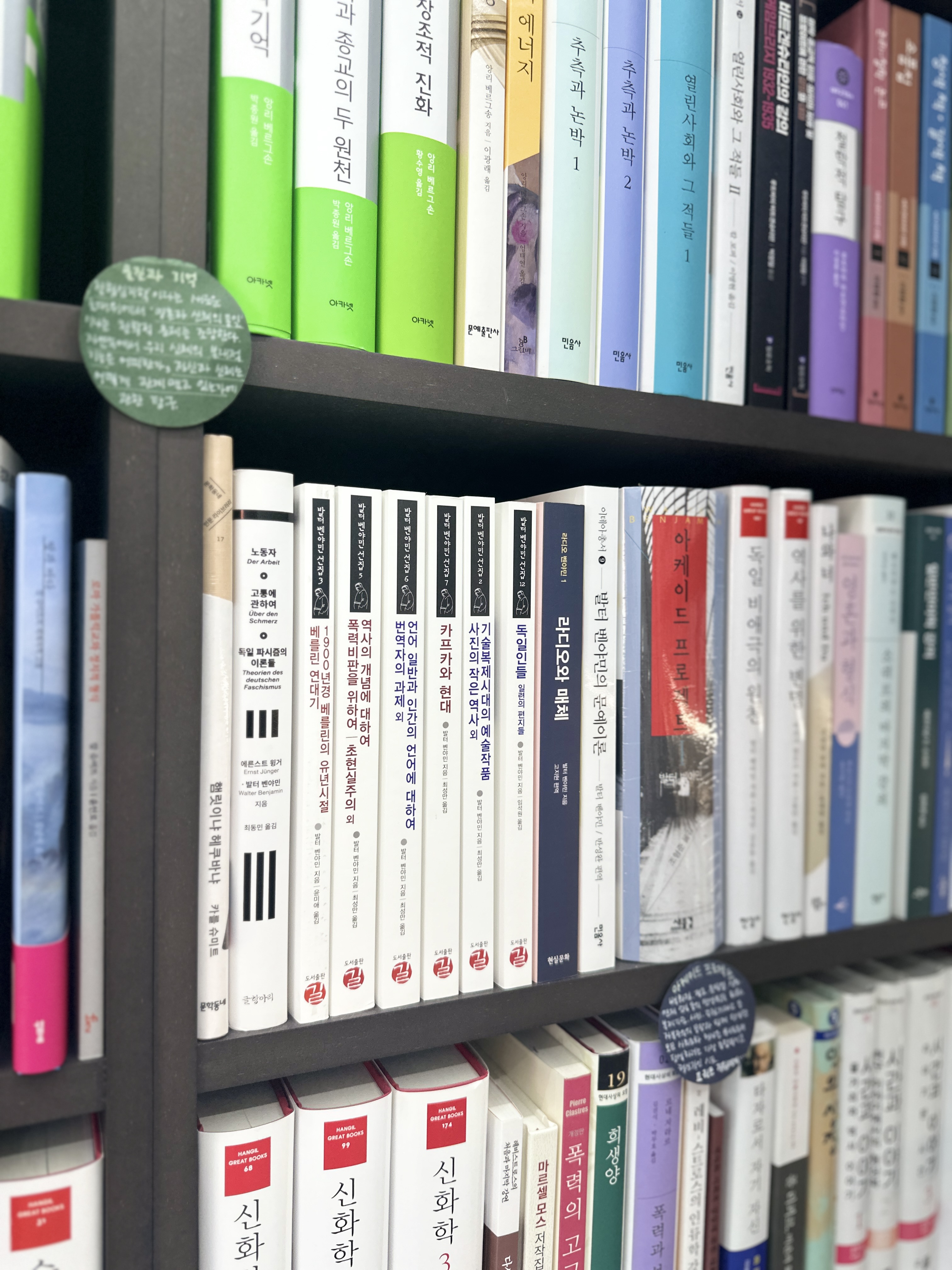 소요서가는 철학 전문 서점으로, 서양 철학, 동양 철학, 종교 철학, 정치 철학 등 다양한 분류의 철학서들과 어린이와 청소년을 위한 철학 서적들까지 정말 철학 서적의 모든 것을 망라한 서점이더라고요. 책방지기님이 직접 메모하신 책 소개글, 매월 소요공방에서 함께 읽는 책들을 월별로 전시한 모습도 아기자기하면서도 짜임새 있어 보였고요. 철학, 예술, 역사 분야 도서를 출간하는 출판사와, 철학 덕후들을 위해 소요공방이라는 이름으로 정기 모임이나 강연들을 진행하는 알찬 곳이었습니다(특히나 개인적으로 응원하는 도서출판100에서 출간한 <독일 철학 개론>이 소요공방 모임 도서로 선정된 것을 보고 무척 반가웠습니다).